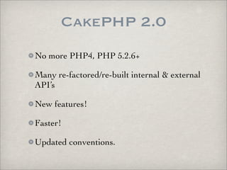 CakePHP 2.0 has been re-factored and rebuilt with many internal and external API changes. It uses native PHP5 features, updated conventions for class and file names, and a new loader. Exceptions replace the old error handling. Collections unify how helpers, components, behaviors and tasks are loaded and used. The console, request/response, sessions, authentication, email, and testing have all been improved for better performance and extensibility. Benchmarks show CakePHP 2.0 has significantly better performance than 1.3.11.