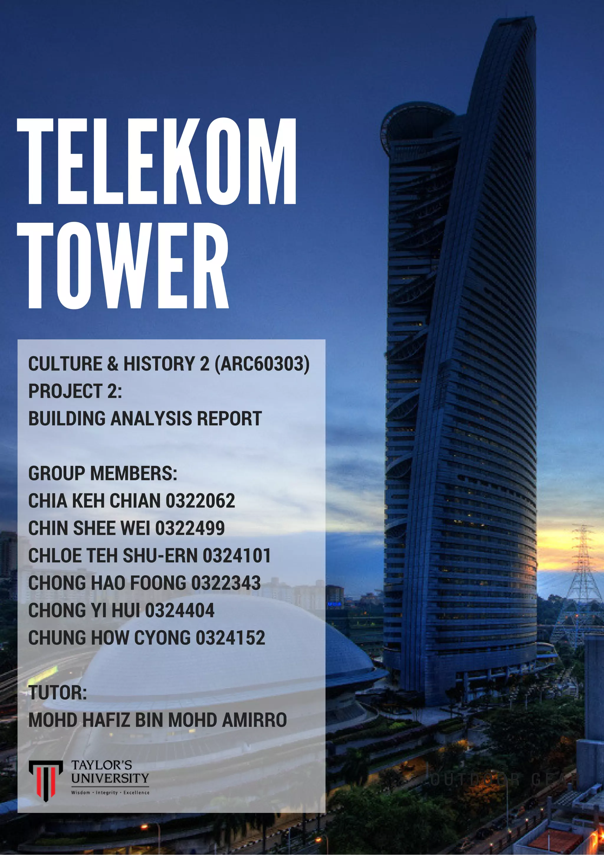 The document provides an analysis of the Telekom Tower building in Kuala Lumpur, Malaysia. It includes fast facts about the building, its history and architect. The analysis covers the building's site context, accessibility, climate response and relationships to surroundings. It examines the architectural layout including floor plans, elevations, sections and circulation. It also analyzes the building style, elements, and compares it to another building. In summary, the document provides a comprehensive analysis of the design, construction and context of the iconic Telekom Tower skyscraper in Kuala Lumpur.