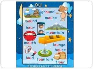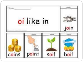 This document provides objectives and examples for teaching the phonetic sounds "ch", "th", "sh", "ng", "oi", and "ou" to students. It lists common words containing each sound and encourages students to read, identify, write and use these words. It directs students to a video on "th" words and assigns a workbook page for additional practice with words exemplifying the target sounds.