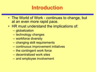 - The world of work is changing rapidly due to globalization, technology advances, workforce diversity, and other factors.