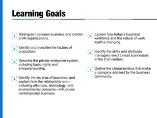 1) The document discusses how business and management are changing in the 21st century due to factors like new technologies, a more globalized and diverse workforce, and an increased focus on relationships and collaboration.