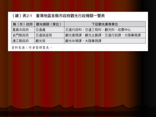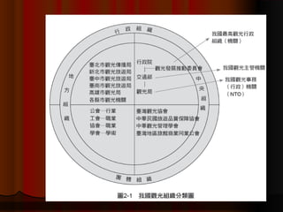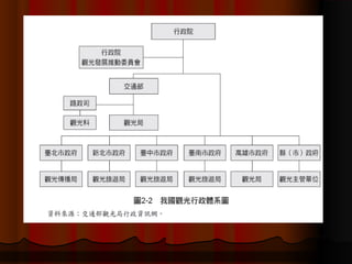 本文件探討我國觀光組織體制的發展,包括狹義及廣義的觀光政策和行政,法規及其演變過程。文件詳細說明了從戰後到現在臺灣觀光產業的歷史演變,並分析各個時期的觀光政策變化與影響。最後,還介紹了各級政府的觀光行政組織結構及功能。