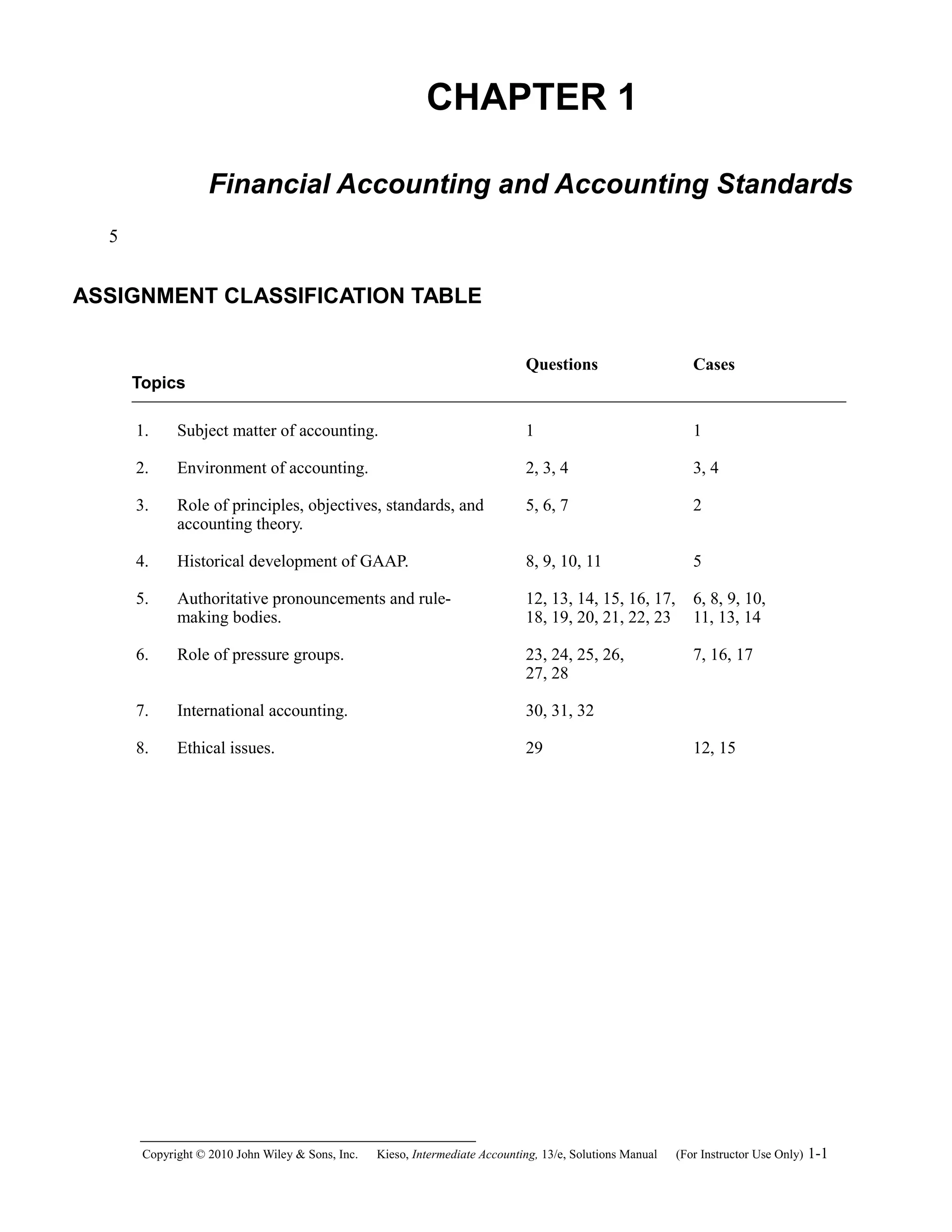 This document provides an overview of chapter 1 of an accounting textbook, including a table of topics covered in the chapter and case/question assignments. It also includes sample solutions to codification exercises and answers to questions about the development of accounting standards and standard-setting bodies in the United States.