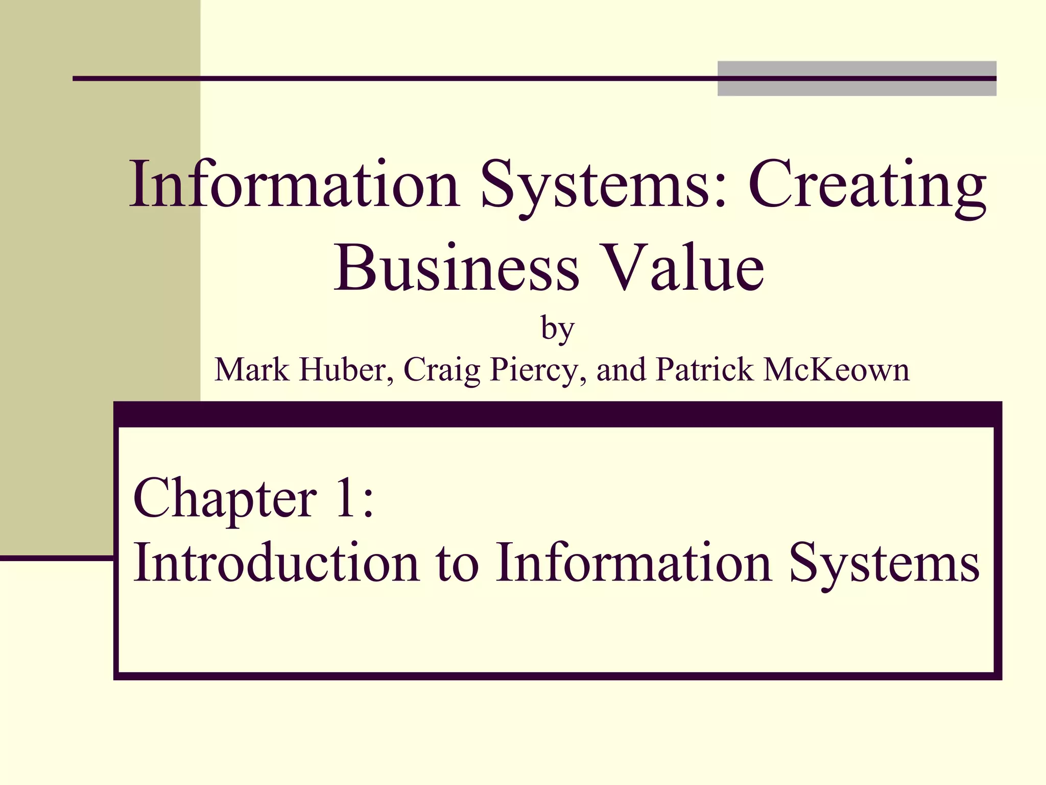 This document summarizes the key points from the introduction chapter of the textbook "Information Systems: Creating Business Value". It discusses the importance of knowledge work and knowledge workers in modern businesses. It defines key terms like data, information, information systems, and different types of IS. It also explains how factors like globalization and the internet are impacting businesses and their need for timely access to data and information.