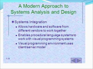 The document discusses business systems and provides examples of how data is transformed into information through capturing, manipulating, storing, and providing access to data which then results in query responses, decision outcomes, expert system advice, and transaction/report outputs. It also covers different types of systems including abstract/physical, deterministic/probabilistic, closed/open, and human-machine systems.