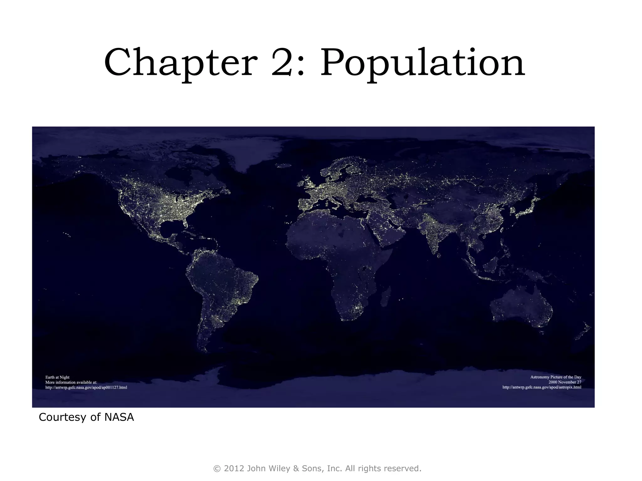 This document summarizes key concepts from Chapter 2 of a geography textbook on population. It discusses where people live and why, factors that influence population growth and decline, and how population composition impacts societies. Specific topics covered include population density, birth and death rates, age-sex population pyramids, the demographic transition model, and how geography influences health and population dynamics. Maps and diagrams are included to illustrate global and regional population patterns and trends.