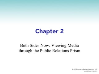 This chapter discusses the relationship between media and public relations and how they both aim to disseminate information from their own perspectives. It explores how crises can present opportunities if handled properly through PR, and how the evolution of technology and social media has changed the media landscape. Effective PR relies on understanding media opportunities and leveraging relationships to frame narratives to an organization's benefit, while still maintaining integrity in communication.