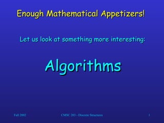 The document provides an overview of algorithms, defining them as a finite set of precise instructions for computation and discussing their essential properties such as input, output, correctness, and effectiveness. It includes examples of algorithms like linear and binary search, highlighting their efficiency differences and the significance of time complexity in relation to input size. Additionally, it introduces big-O notation for analyzing the growth of functions and categorizes problems based on their complexity.