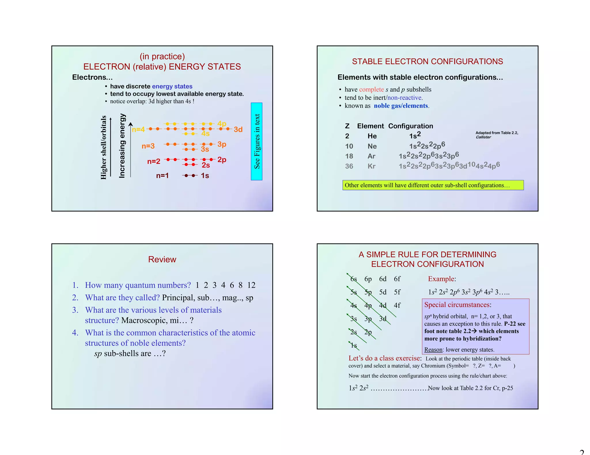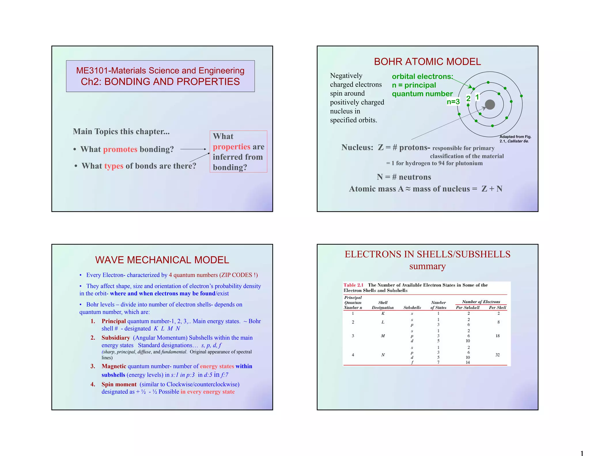 - The document discusses various topics related to bonding and properties in materials, including the different types of bonds (ionic, covalent, metallic), properties inferred from bonding (melting temperature, elastic modulus), and factors that influence bonding properties (bond energy, interatomic distance).