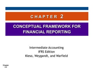 The conceptual framework establishes fundamental concepts that guide standard-setting and financial reporting more broadly. It is being jointly developed by the IASB and FASB and consists of three levels: the objective of financial reporting, qualitative characteristics, and specific concepts. The objective is to provide useful information to capital providers. Key qualitative characteristics include relevance and faithful representation. The framework also outlines basic elements, assumptions, principles, and constraints that guide accounting practices. It aims to create consistency and coherence in financial reporting standards over time.