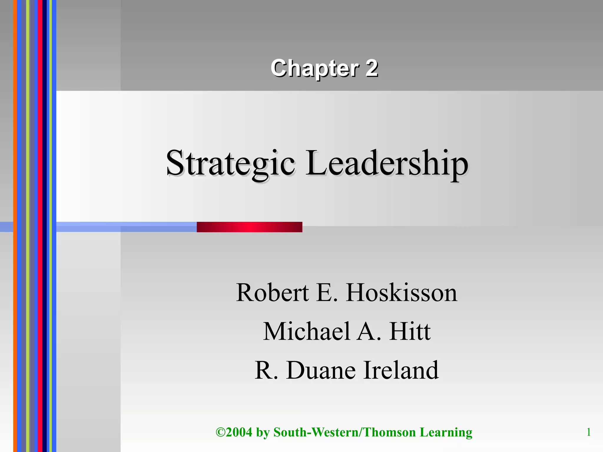 Strategic leadership is important for determining strategic direction, exploiting core competencies, developing human capital, sustaining culture, emphasizing ethics, and establishing controls. Effective strategic leaders balance strategic and financial controls to achieve long-term returns. Characteristics of leaders, teams, and the environment influence the discretion leaders have over strategic decisions.