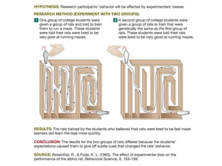 This document summarizes different types of psychological research methods: descriptive research simply observes and measures behaviors; correlational research tests relationships between variables but cannot prove causation; experimental research tests causal hypotheses by manipulating an independent variable and measuring its effects on a dependent variable with a control group for comparison. Biases that can influence results are also discussed.