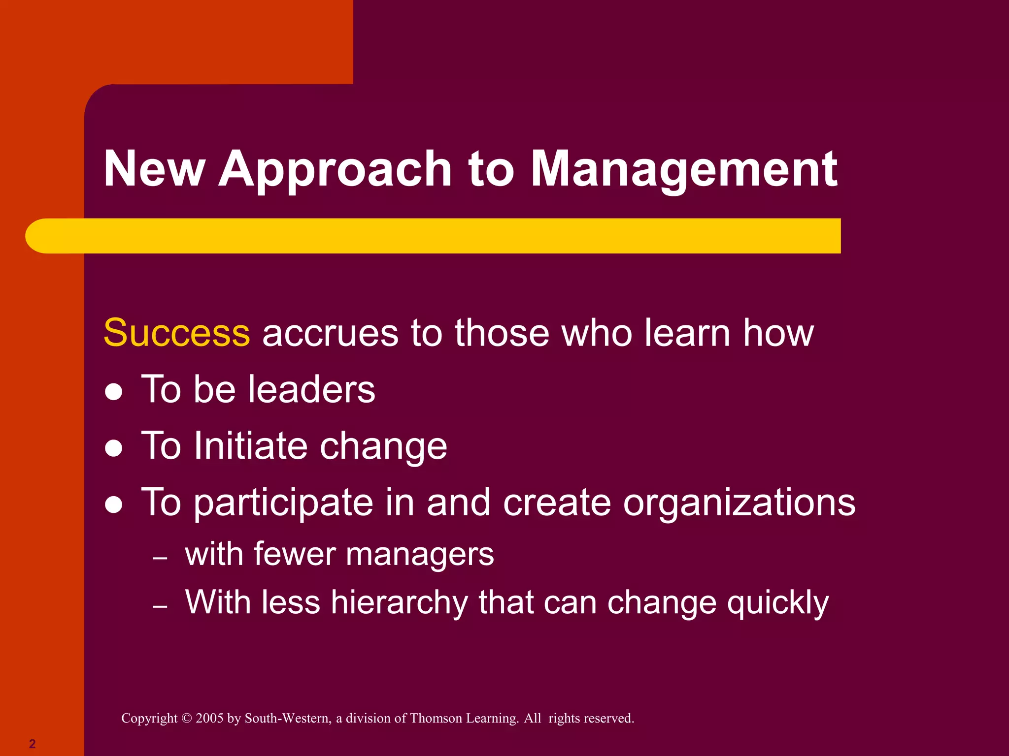 The document discusses the evolution of management thinking over time. Early approaches included scientific management which focused on standardizing jobs. Bureaucratic organizations emphasized hierarchy and rules. Later, the human relations movement emphasized satisfying employee needs. More recent approaches include systems theory which views organizations holistically, contingency theory which stresses adapting to situations, and learning organizations which emphasize open information sharing.