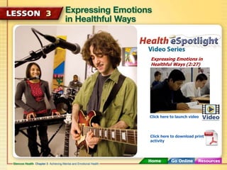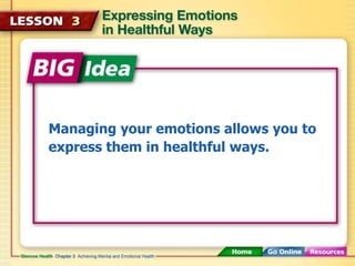 This document discusses managing emotions in healthy ways. It explains that recognizing and understanding emotions helps manage them better. Hormonal changes during puberty can cause mood swings. While emotions themselves are neutral, expressing them constructively through empathy, self-reflection, and coping strategies leads to well-being, whereas hostility and defense mechanisms can harm relationships and health. The document provides tips for handling difficult emotions like fear, guilt, and anger through relaxation, activity, and social support.
