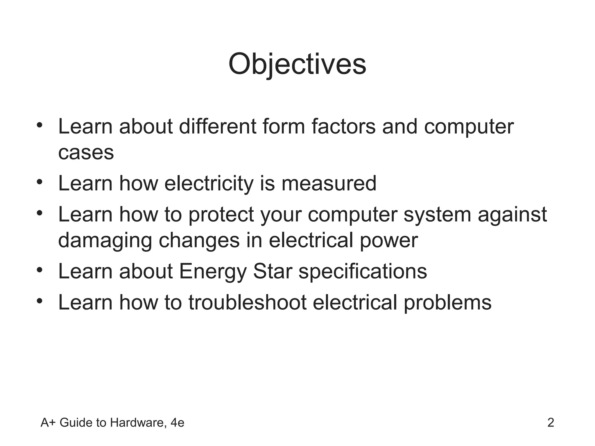 This document provides an overview of computer form factors, power supplies, and troubleshooting electrical problems. It discusses different form factors for motherboards, cases, and power supplies. It also covers topics like measuring electricity, protecting computers from electrical threats, and diagnosing power issues. The objectives are to learn about form factors, electrical measurements, surge protection, and troubleshooting power problems.