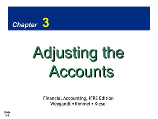 The document provides an overview of adjusting entries and related accounting concepts. It begins with explaining the time period assumption and how accountants divide a business's economic life into artificial time periods. Then it discusses the accrual basis of accounting and how revenues are recognized when earned and expenses are recognized when incurred. The reasons for adjusting entries are to ensure revenues and expenses are recorded in the proper periods according to accrual accounting. The major types of adjusting entries are identified as those for deferrals, such as prepaid expenses and unearned revenues, and those for accruals, such as accrued revenues and accrued expenses. Instructions and examples are provided for preparing adjusting entries for deferrals.