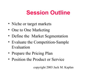 This document provides an overview of how to analyze markets, customers, and competition when starting a new business. It discusses identifying niche markets, conducting market segmentation, evaluating competitors, developing a pricing plan, and positioning products or services. Key aspects covered include defining target customer segments, conducting competitive analyses, assessing strengths/weaknesses, and determining appropriate pricing strategies. The document provides questions to consider and sample evaluations for each step of the market analysis and planning process.
