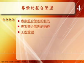4 專案整合管理的目的 專案整合管理的過程 工程管理 專案管理-知識體系的觀點 Chapter 4 專案的整合管理 4-2