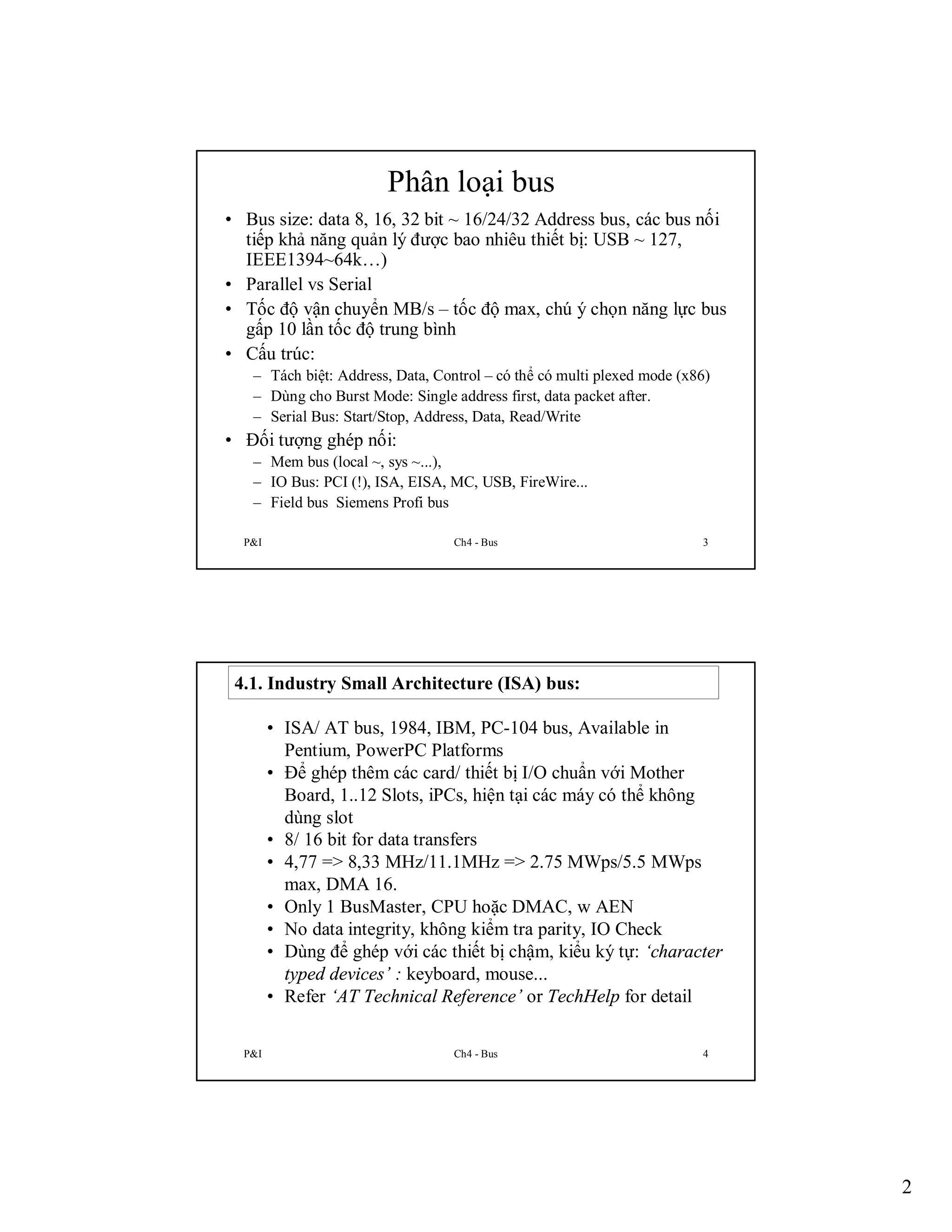 Chương 4 trình bày tổng quan về các bus giao tiếp I/O, bao gồm các loại bus như ISA, USB, PCI, và SCSI, cùng với các đặc điểm và ứng dụng của chúng trong hệ thống máy tính. Việc phân loại bus dựa trên tốc độ, kiểu kết nối (song song hoặc nối tiếp), và khả năng quản lý thiết bị được đề cập. Ngoài ra, các ví dụ cụ thể về các bus như USB và I2C cũng được cung cấp để minh họa cách thức hoạt động và ứng dụng trong các thiết bị điện tử hiện đại.