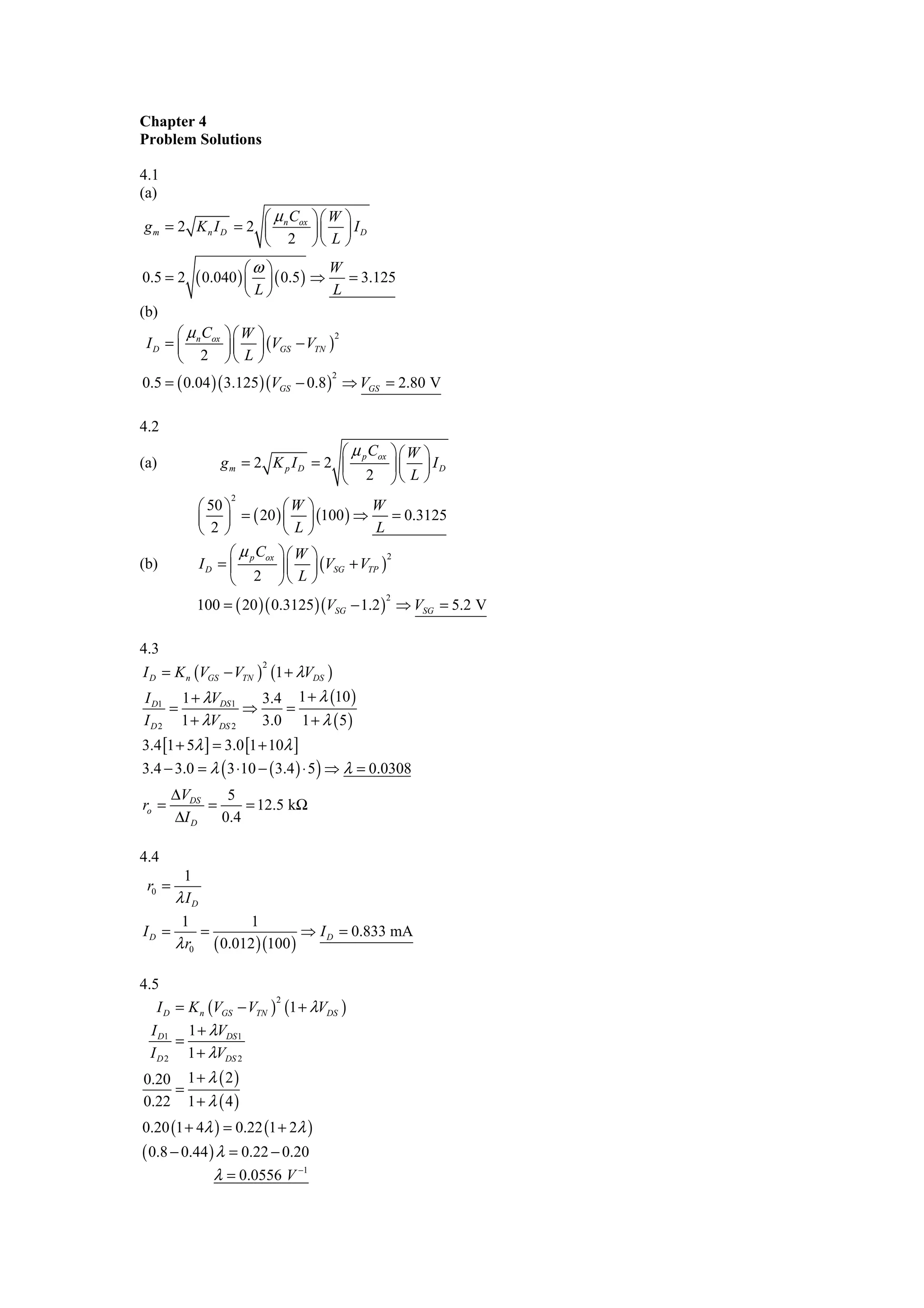 2) Equations are provided and used to solve for transistor parameters like threshold voltage, transconductance, and output resistance.