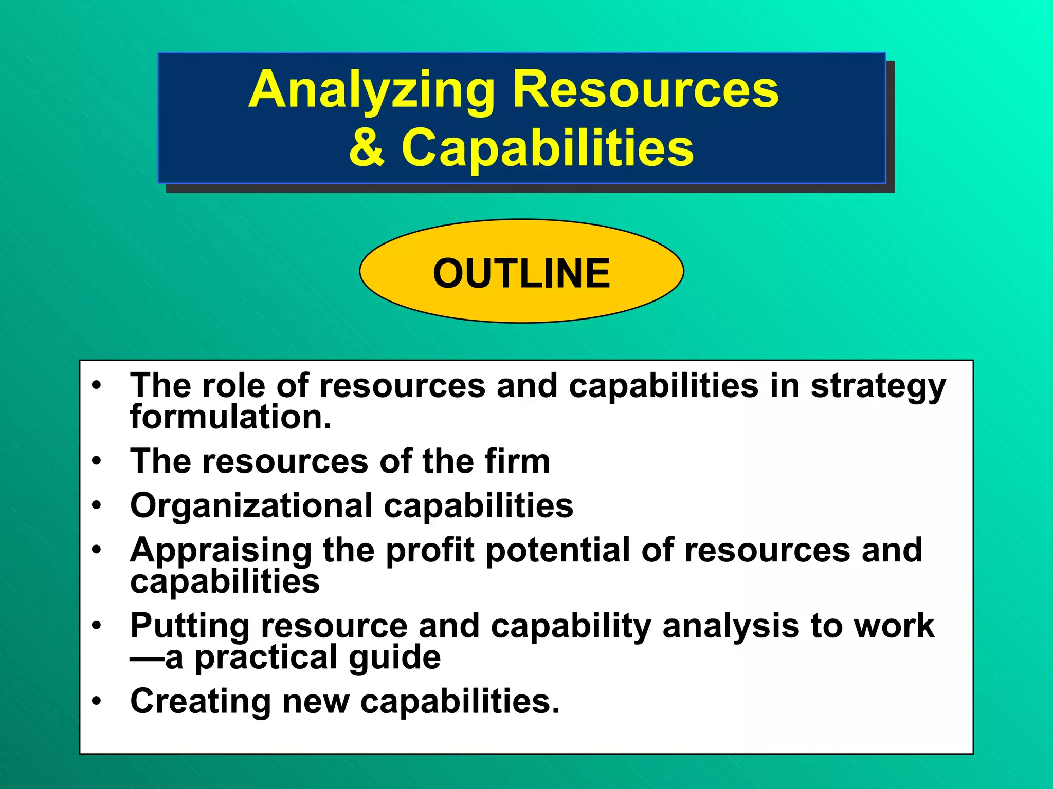 Analyzing Resources & Capabilities The role of resources and capabilities in strategy formulation. The resources of the firm Organizational capabilities Appraising the profit potential of resources and capabilities Putting resource and capability analysis to work—a practical guide Creating new capabilities. OUTLINE