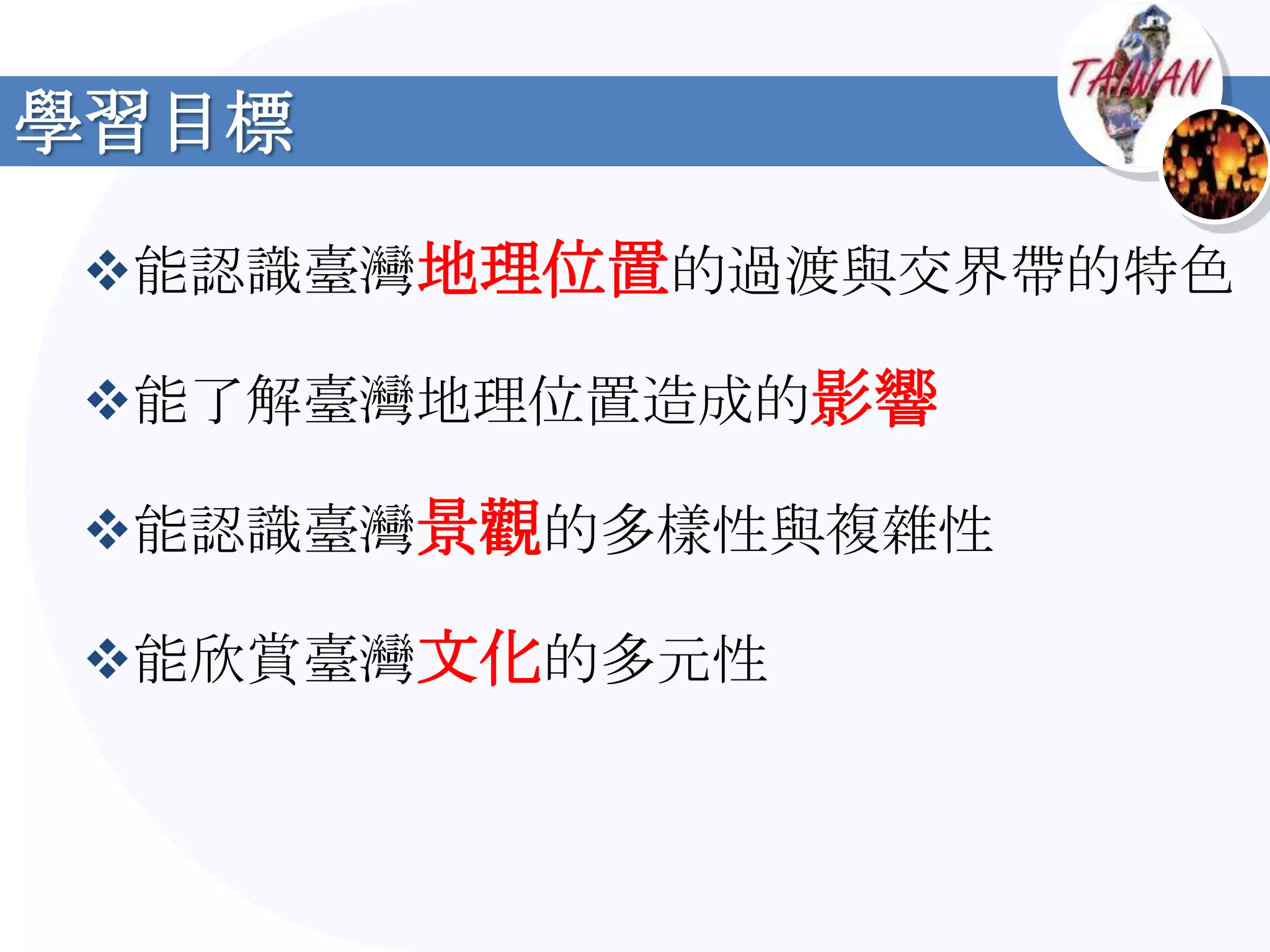 文档介绍了台湾的地理位置与环境特色,强调其多样的地形、气候及丰富的生态景观。台湾位于东亚岛弧中,与多个文化相互交融,拥有多元文化背景。学习目标包括认识台湾的地理、环境和文化多样性。