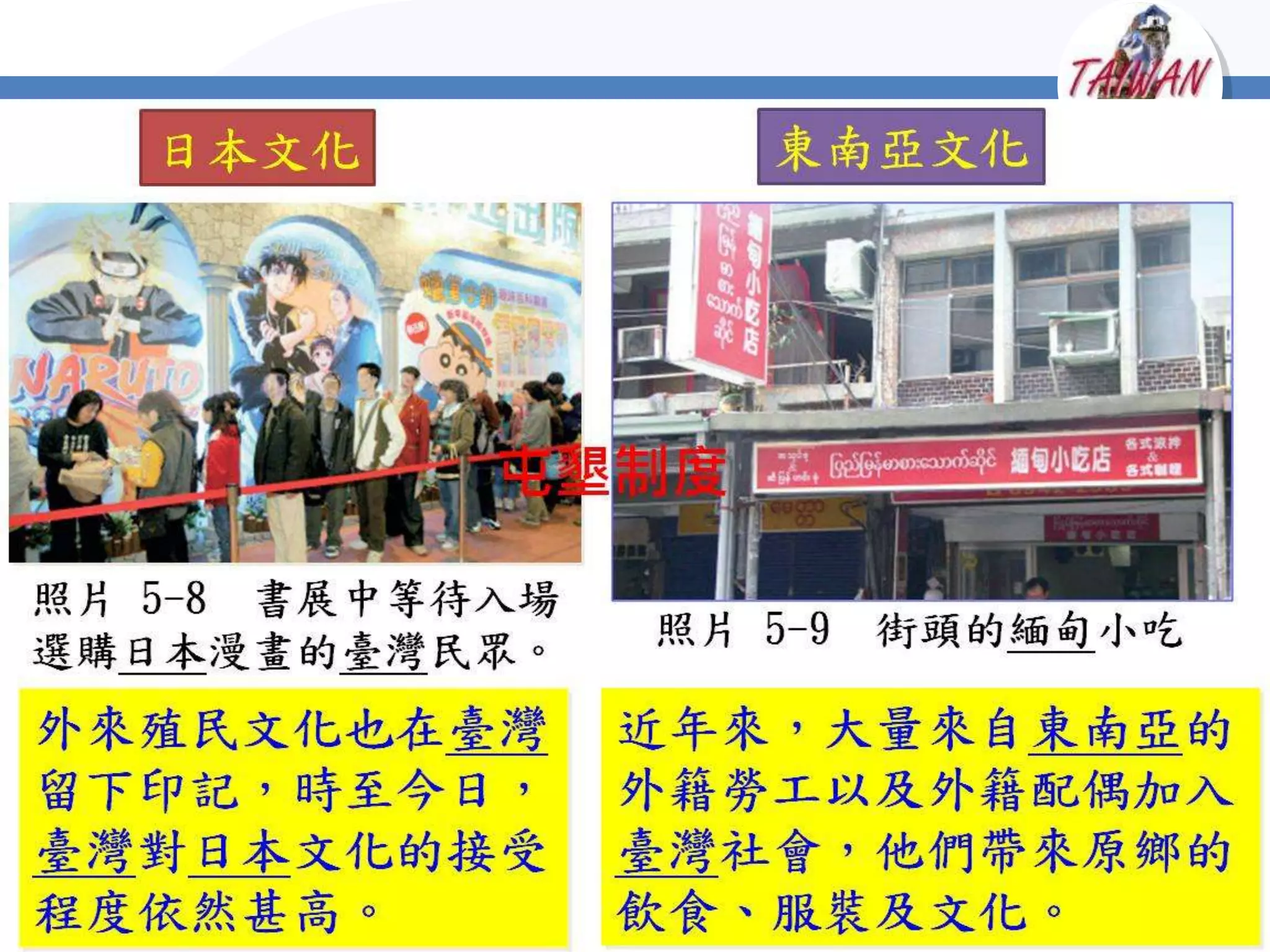 日本文化: 日本殖民統治五十年,留下了歷史性建築,並 影響老一輩人的思想與生活。 今日年輕一代亦高度接受日本文化。 外勞 4. 東南亞文化:大量東南亞的______及外籍 配偶加入臺灣社會