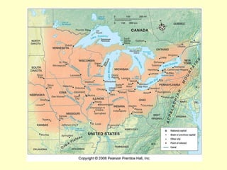 3) Transportation infrastructure like canals and railroads were crucial to the region's growth and connecting resources to major markets.