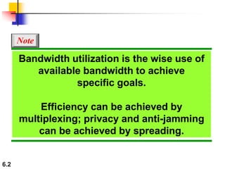 This document discusses bandwidth utilization techniques including multiplexing and spreading. It begins by defining multiplexing as techniques that allow simultaneous transmission of multiple signals across a single data link. Specific multiplexing techniques discussed include frequency-division multiplexing, wavelength-division multiplexing, synchronous time-division multiplexing, and statistical time-division multiplexing. Spread spectrum techniques like frequency hopping spread spectrum and direct sequence spread spectrum are also covered as ways to combine signals from different sources to prevent eavesdropping and jamming. Examples are provided to illustrate how these different bandwidth utilization techniques work.