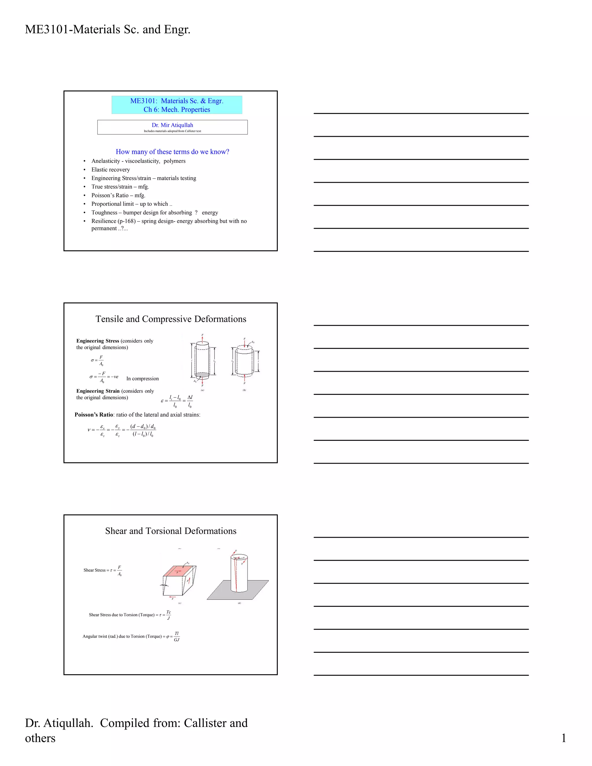 The document summarizes key concepts related to mechanical properties of materials from Chapter 6 of Callister's Materials Science and Engineering text. It defines terms like elasticity, yield strength, tensile strength, ductility, resilience, toughness, and hardness. Tables provide data on these properties for various classes of materials like metals, ceramics, polymers, and composites. Equations are presented relating stress to strain for elastic deformation as well as definitions of elastic moduli.