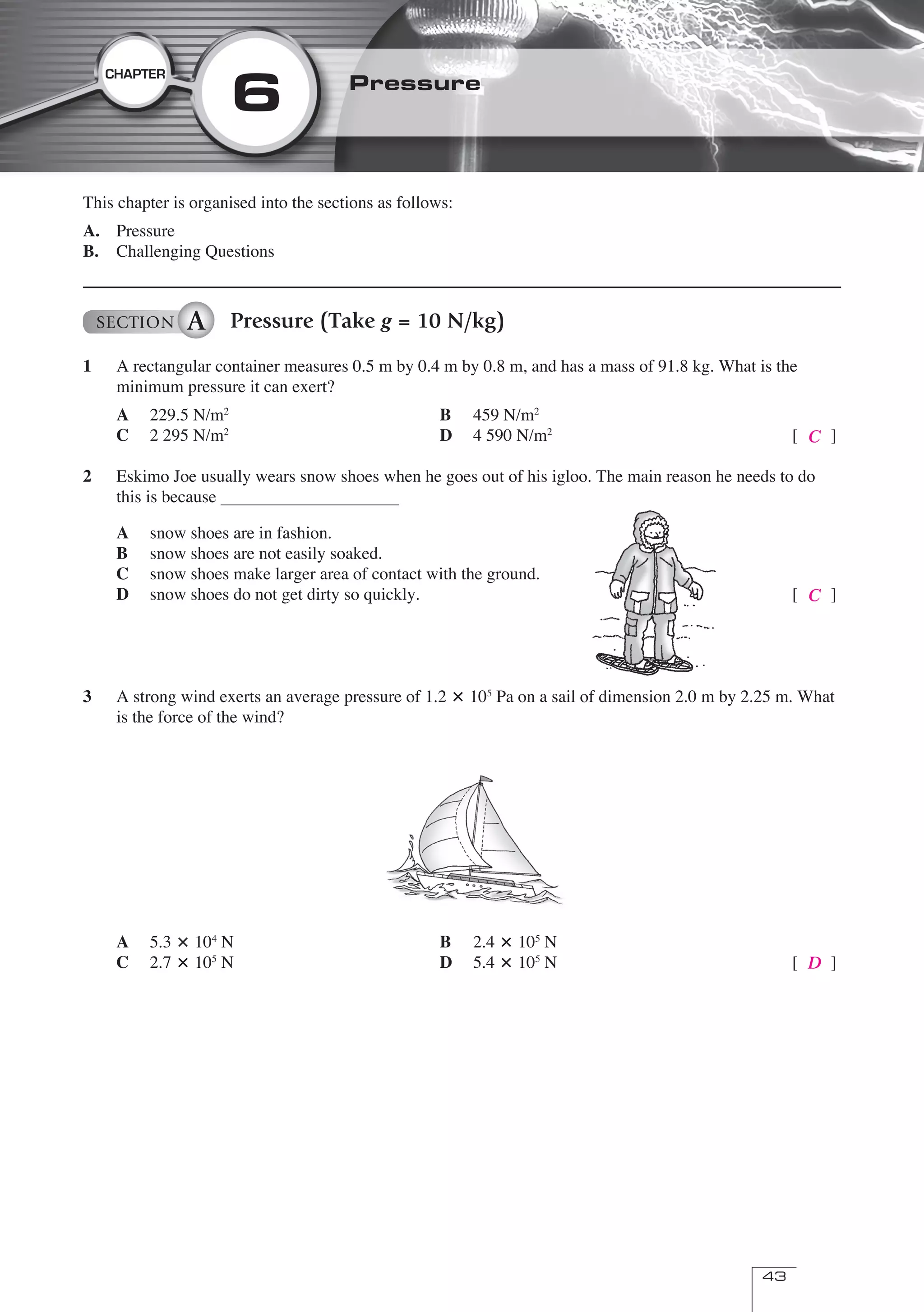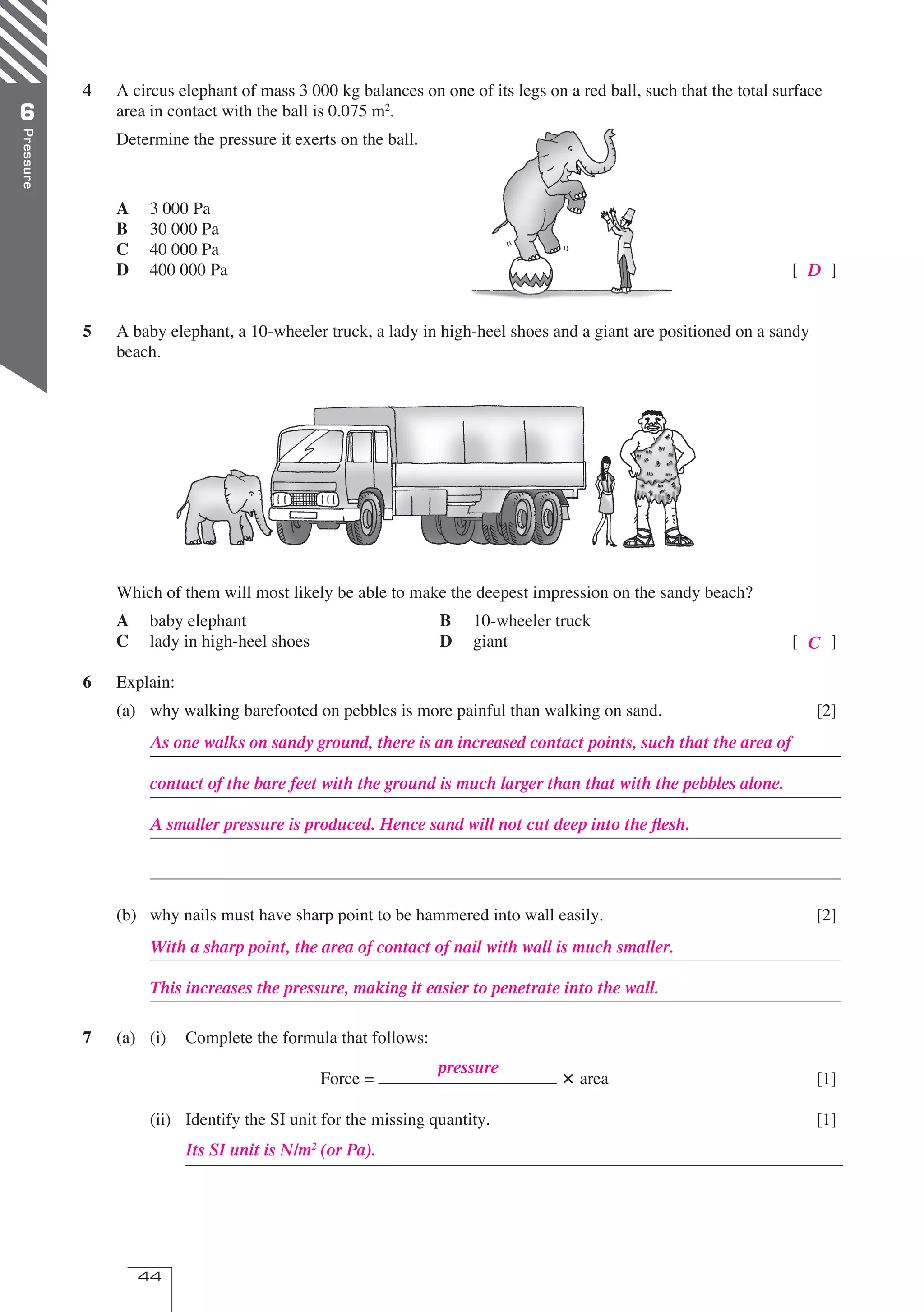 This document discusses pressure and provides examples of pressure calculations. It begins by defining pressure as force per unit area and discusses the relationship between pressure, force and area of contact. Examples then calculate pressure in various situations like a container holding water, a sail experiencing wind force, and an elephant balancing on a ball. The document concludes by discussing why walking on sand is less painful than pebbles and why nails must be sharp to hammer into walls.