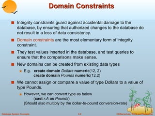 The document discusses various aspects of database integrity and security including domain constraints, referential integrity, triggers, assertions, and authorization. Domain constraints ensure values inserted are valid. Referential integrity ensures relationships between relations are maintained. Triggers allow automatic execution of actions on data modifications. Assertions specify conditions that should always be true. Authorization controls user access to data and modifications. Views can provide secure access to restricted data.