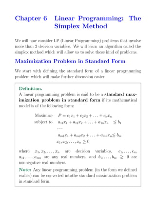 The document introduces the simplex method for solving linear programming problems with more than two decision variables. It explains how to convert a linear programming problem into standard form and an initial system of equations by introducing slack variables. The simplex method works by iteratively selecting entering and exiting variables to move between basic feasible solutions along the edges of the polyhedron until an optimal solution is found. It uses a simplex tableau to represent the initial system and track the basic and nonbasic variables at each step.