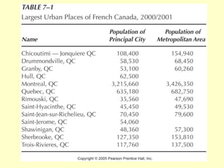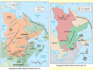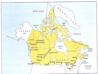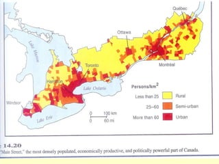 This document summarizes key aspects of Canada's core region, focusing on Quebec and Ontario. It describes the core's physical geography, history of settlement by Aboriginal peoples and Europeans, and current cultural divisions. Quebec has a unique French cultural identity and still shows remnants of the seigneurial system of land grants. Ontario developed with a mix of British and American influences and is now the economic engine of Canada. Both provinces face constraints from the environment but benefit from their location along major transportation routes.