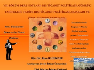 Ders: Uluslararası İktisatve Dış Ticaret Politikası Sunumlarda Paul R. Krugman ve Maurice Obstfeld tarafından yazılmış “ International Economics: Theory and Policy ” ve Halil Seyidoğlu tarafından yazılmış “ Uluslararası İktisat: Teori, Politika ve Uygulama ” isimli ders kitabları temel alınmıştır. V II. BÖLÜM DERS NOTLARI: DIŞ TİCARET POLİTİKASI, GÜMRÜK TARİFELERİ, TARİFE DIŞI TİCARET POLİTİKASI ARAÇLARI VE ÖZEL GÜMRÜK REJİMLERİ Öğr. Gör. Elşen BAĞIRZADE Azerbaycan Devlet İktisat Üniversitesi Türk Dünyası İşletme Fakültesi Bakü - 2009