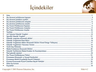 İçindekiler Giriş ...........................................................................................................................................................................................3 Dış ekonomi politikasının kapsamı ............................................................................................................................................ 4 Dış ekonomi politikası çeşitleri ................................................................................................................................................. 5 Dış ekonomi politikasının amaçları ........................................................................................................................................... 6 Dış ekonomi politikasının araçları ............................................................................................................................................. 7 Dış Ticaret Politikasının Kapsam ı ............................................................................................................................................. 8 Dış Ticaret Politikasının Amaçları ............................................................................................................................................ 9 Dış Ticaret Politikasının Araçları ............................................................................................................................................ 10 Tarifeler .................................................................................................................................................................................... 11 Ad Valorem Gümrük Vergiler i ................................................................................................................................................ 12 Spesifik Gümrük Vergileri ...................................................................................................................................................... 13 Gümrük vergisinin ekonomik etkileri ...................................................................................................................................... 14 Gümrük Vergi lerin in Rant Etkisi ............................................................................................................................................. 16 Gümrük Vergi lerin in Makro Ekonomik Etkiler i (Genel Denge Yaklaşımı) ........................................................................... 17 G ümrük V ergilerinin Y ansıması S orunu ................................................................................................................................. 18 T arife D ı ş ı Önlemler ................................................................................................................................................................ 19 İthalat Kotalarının Ekonomik Etkileri ..................................................................................................................................... 26 Gümrük Tarifelerinin İthalat Kotaları ile Karşılaştırılması ..................................................................................................... 27 Ö zel gümrük rejimleri .............................................................................................................................................................. 28 Dış Ticaret Politikalarının Türleri ........................................................................................................................................... 33 Korumanın Ekonomik ve Siyasal Gerekçeleri ......................................................................................................................... 34 Korumanın Belirli Koşullarda Geçerli Nedenler i .................................................................................................................... 35 Koruma Konusunda Kişisel Çıkarlara Dayalı Görüşler .......................................................................................................... 36 E tken dış koruma ..................................................................................................................................................................... 37 Kaynaklar ................................................................................................................................................................................. 38