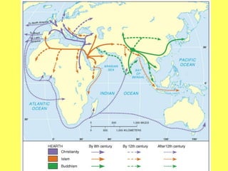 The document provides an overview of several world religions including their classifications, origins, beliefs, sacred texts, founders, and patterns of diffusion. It discusses religions originating from hearths in South Asia (Hinduism, Buddhism), East Asia (Taoism, Confucianism), the Eastern Mediterranean (Judaism, Christianity, Islam), and their spread to other regions through missionary activity, migration, and imperial expansion. Religions are also classified based on whether they are universalizing and actively seek converts, or are ethnic religions tied to particular populations and places. Sacred sites, pilgrimages, and the influence of religions on cultural landscapes are also examined.