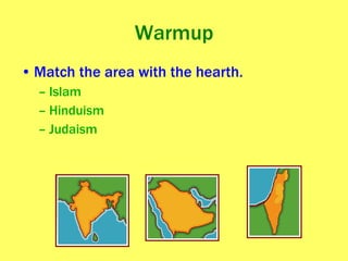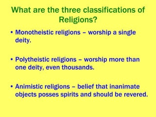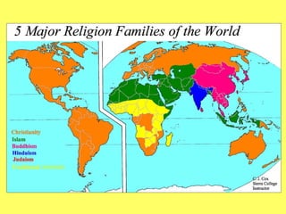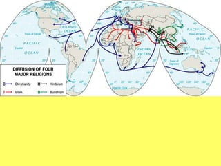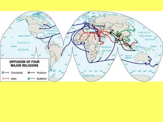 The document provides an overview of various world religions including their classifications, origins, beliefs, sacred sites, and how they have diffused globally. It discusses universalizing religions like Christianity, Islam, and Buddhism which seek converts, as well as ethnic religions like Hinduism and Judaism. The text also examines how religion impacts culture and is expressed in the landscape, including through sacred sites, pilgrimages, and religious divisions and conflicts.