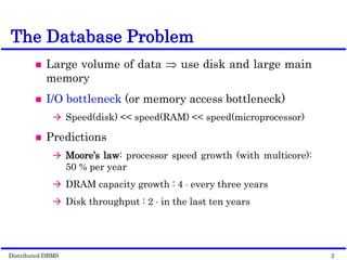 This document discusses parallel database management systems (DBMS) and distributed DBMS. It covers topics like the database problem of handling large volumes of data, solutions like data partitioning and parallel data access. It describes objectives of parallel DBMS like high performance and availability. It discusses hardware architectures for parallel DBMS like shared memory, shared disk and shared nothing. It also covers techniques for parallel DBMS including data placement, parallel query processing and optimization, and challenges of load balancing.