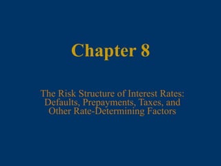 This chapter discusses several factors that influence interest rates: marketability, liquidity, default risk, call privileges, prepayment risk, convertibility, and taxation. It explains how each of these factors affects the promised and expected yields on different types of financial assets. The risk-free interest rate underlies all other interest rates, which are scaled upward depending on their degree of additional risk factors like default risk or prepayment risk.