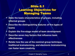 The document provides an overview of key concepts relating to managing teams, including: