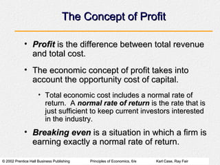 This document summarizes a chapter about costs and output decisions in the long run. It discusses concepts like profit, total costs, variable costs, fixed costs, and how firms determine whether to operate, expand, or shut down based on whether their revenues exceed their total costs and variable costs. It also covers long-run costs related to economies and diseconomies of scale, and how industries adjust in the short and long run through expansion, contraction, entry and exit of firms.