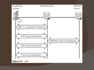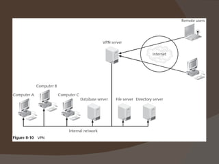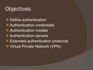 Chapter 8 discusses authentication objectives, defining key concepts like authentication, credentials, and access control. It covers various authentication models and protocols, emphasizing strong security measures such as two-factor authentication and the use of AAA servers. The chapter also explores VPN technologies and remote access policies for secure communication and management of remote users.