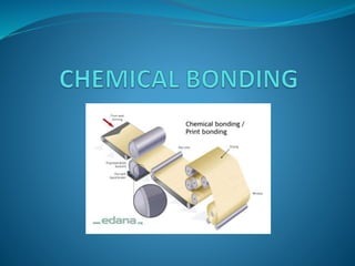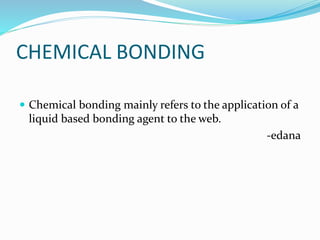 Chemical bonding involves applying a liquid binder to a nonwoven web to improve its characteristics such as strength and durability. Binders work by being applied to the web and then forming strong bonds between the binder and fibers as the moisture or solvent is removed. There are various types of binders classified based on their chemical structure and functionality, including acrylics, styrenated acrylics, and vinyl acetates. Common chemical bonding processes involve saturating, foaming, spraying, printing, or applying binder powders to nonwoven webs. The bonded webs find applications in products like wipes, medical fabrics, and apparel.