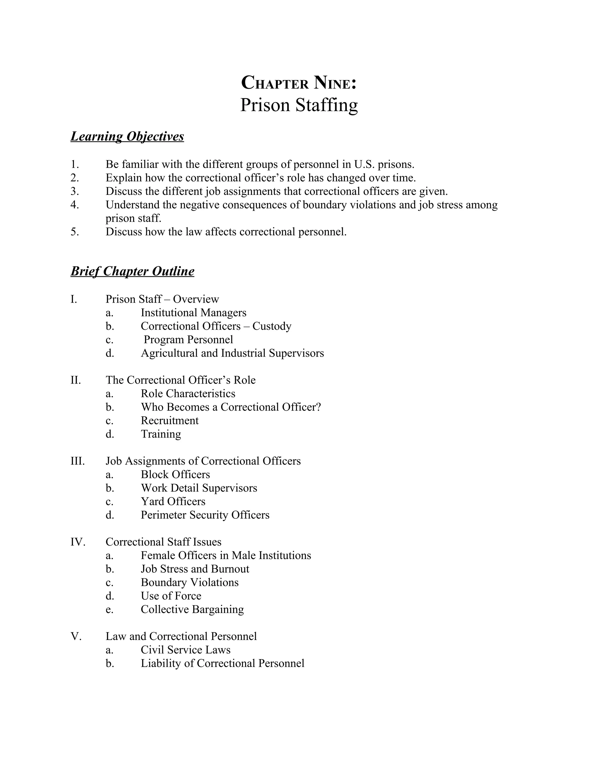 The chapter discusses prison staffing and the roles of different personnel in U.S. prisons. Institutional managers like the warden are responsible for overall prison management. Correctional officers have various ranks and job assignments like housing unit officers, work supervisors, and perimeter security. Their role has expanded from simple inmate guarding to include counseling and rehabilitation support. Program staff oversee education and vocational programs. The chapter also covers issues like job stress, boundary violations, and how civil service and other laws affect correctional personnel responsibilities and liability.