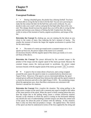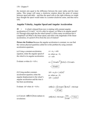 The document contains multiple physics problems related to rotation, torque, angular acceleration, and moments of inertia. One problem involves calculating the angular speed of a winch drum that is lifting a 2000 kg block at a constant speed of 8 cm/s. It is determined that: