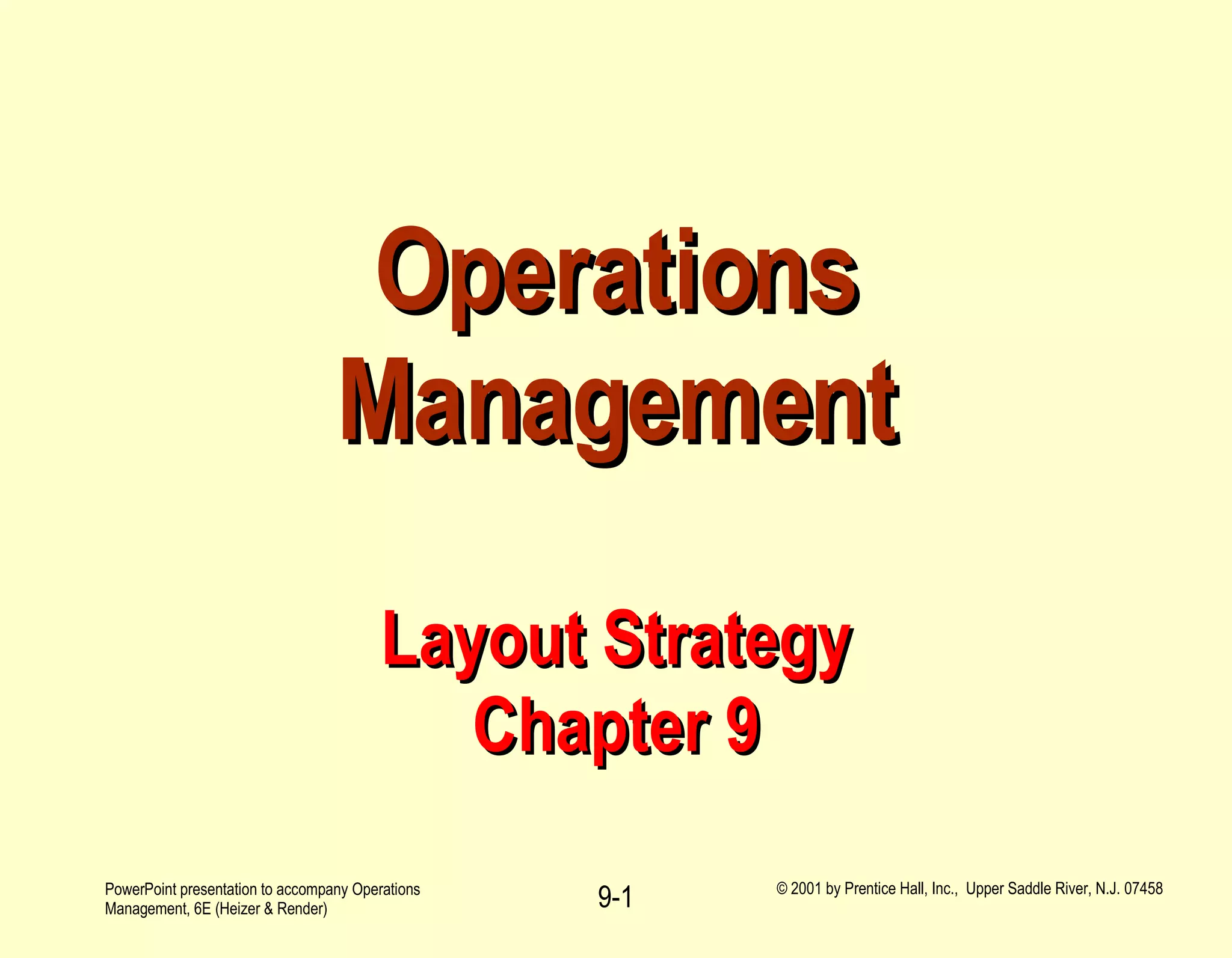 The document discusses various layout strategies for operations management including fixed-position, process-oriented, office, retail, warehouse, and product-oriented layouts. It provides examples of each type and describes factors to consider like material flow, work cells, and balancing assembly lines. The key objectives are to maximize space utilization, workflow, employee morale, and customer satisfaction.