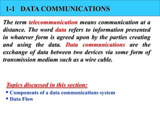 This document discusses data communications and computer networks. It covers the components of a data communication system including transmission media and data flow modes. It then discusses computer networks, defining them as connected devices that exchange data. It covers network criteria like performance, reliability and security. It also covers physical network structures like topology and the categories of local, wide and metropolitan area networks. Finally, it provides an overview of the Internet, its organization and Internet service providers.