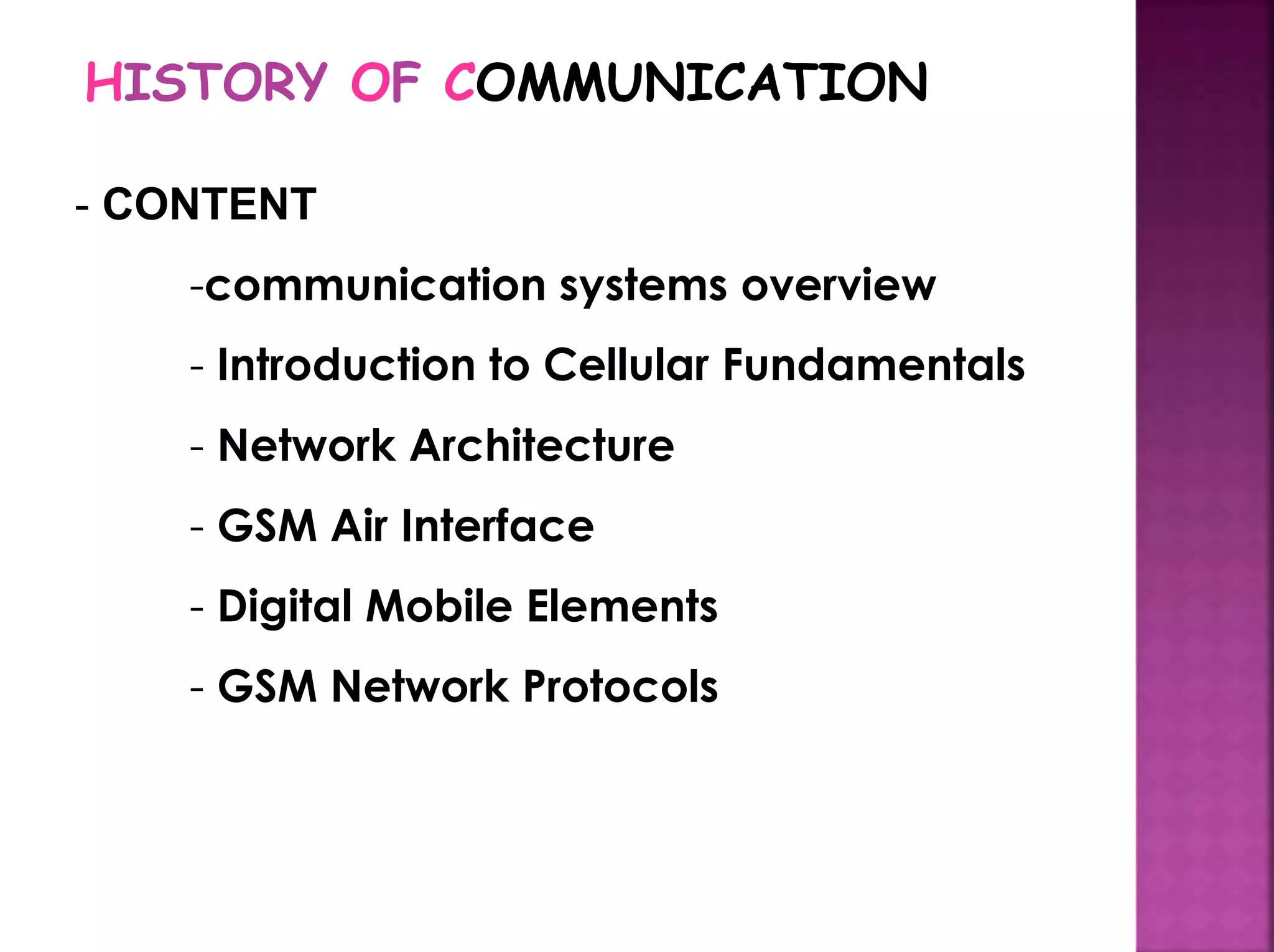 This document provides an overview of the history and fundamentals of cellular communication systems. It discusses early communication networks and switching devices. It then covers the transition to digital cellular networks and describes key technologies like FDMA, TDMA, frequency reuse, and cellular structure. The document outlines generations of cellular standards and discusses aspects of cellular networks like cell shapes, sizes, splitting, and channel allocation techniques. It also covers issues like multipath fading, Doppler shift, interference, and methods to address them.