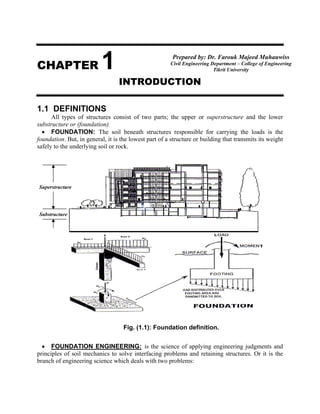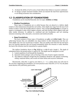 This document defines foundations and foundation engineering. It discusses shallow and deep foundations. Shallow foundations include spread, combined, wall/strip, and mat foundations. Deep foundations include piles and piers. It describes factors in foundation design such as ultimate bearing capacity, settlement, and differential settlement. Footing failures by shear, tension, or bearing capacity are addressed. Examples of isolated, combined, and wall footings are provided along with factors in selecting the appropriate foundation type.